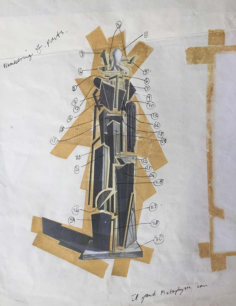 There were several important friendships that I formed at Portsmouth College of Art in the 1963-1967 period on my Diploma in Art & Design Foundation and undergrad course. I’ve talked about my early experiences with Martin Harford, Gary Crossley, Pete Harris, John Czaky and George Hardie elsewhere, but Maurice Owen was also special - and different in that he pursued his career as a research artist for his whole lifetime, like myself, but also because he remained focussed on a singular form: sculpture, most of the time. I say most, because I was drawn to him at first because he produced a play - a setting of Alfred Jarry’s Ubu Roi ( written in 1896, when Jarry was 23). And this was brilliant. And thanks for introducing me to Jarry - a unique contribution to the fin de siecle cultural landscape. But wait, Maurice was in the Sculpture studios, and I must note his work on perspective reconstructions he derived brilliantly from De Chirico’s painting The Great Metaphysician (Il Grande Matafisico of 1917) 3D constructions derived from de Chirico’s flat painting, reconstructions based upon whether the set-square in the painting was 45/90 degrees, or 60/30 degrees.